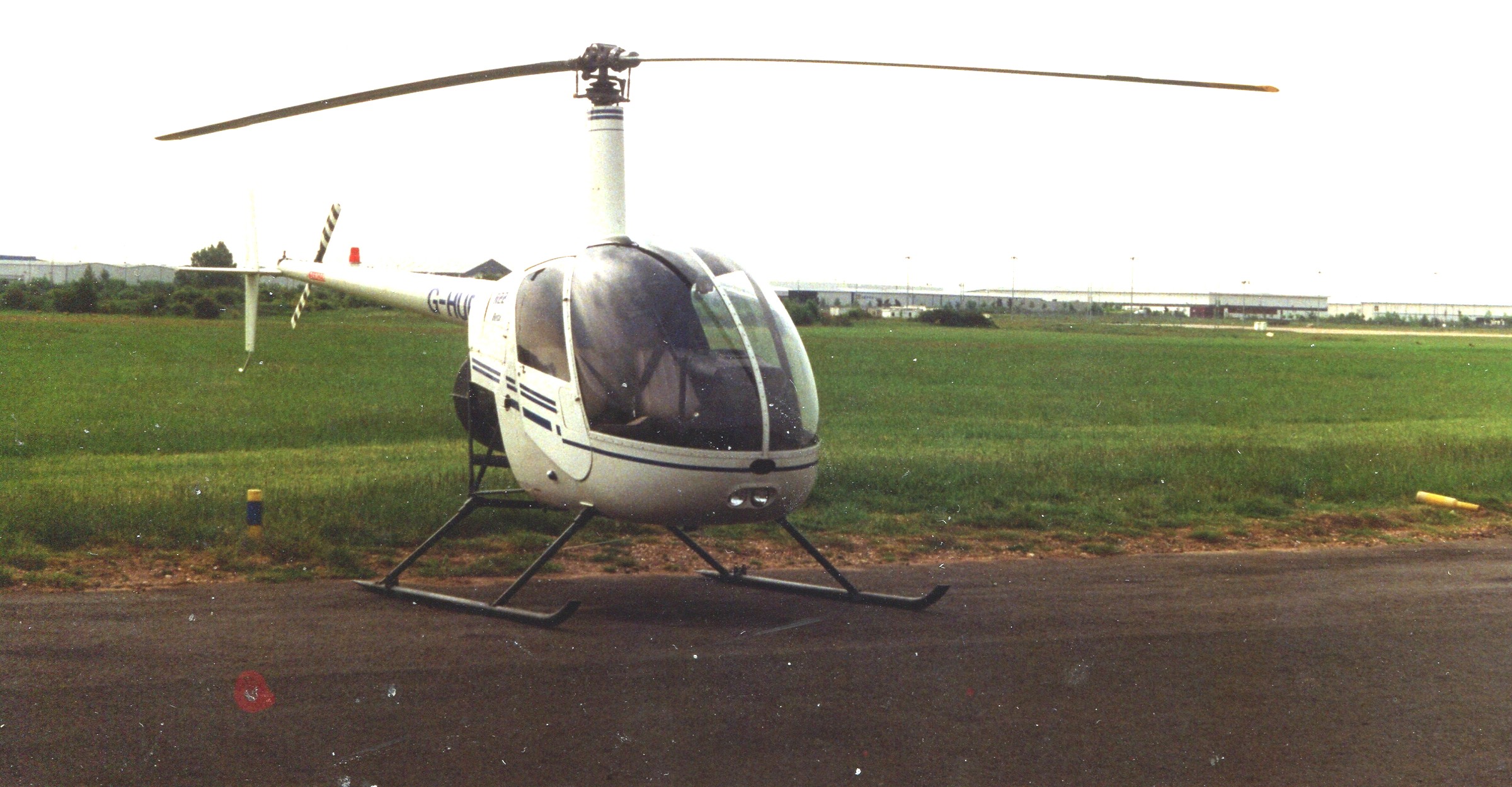 Robinson R22 helicopter, registration G-HURN, outside the Coventry Aeroplane Club, Coventry Airport.