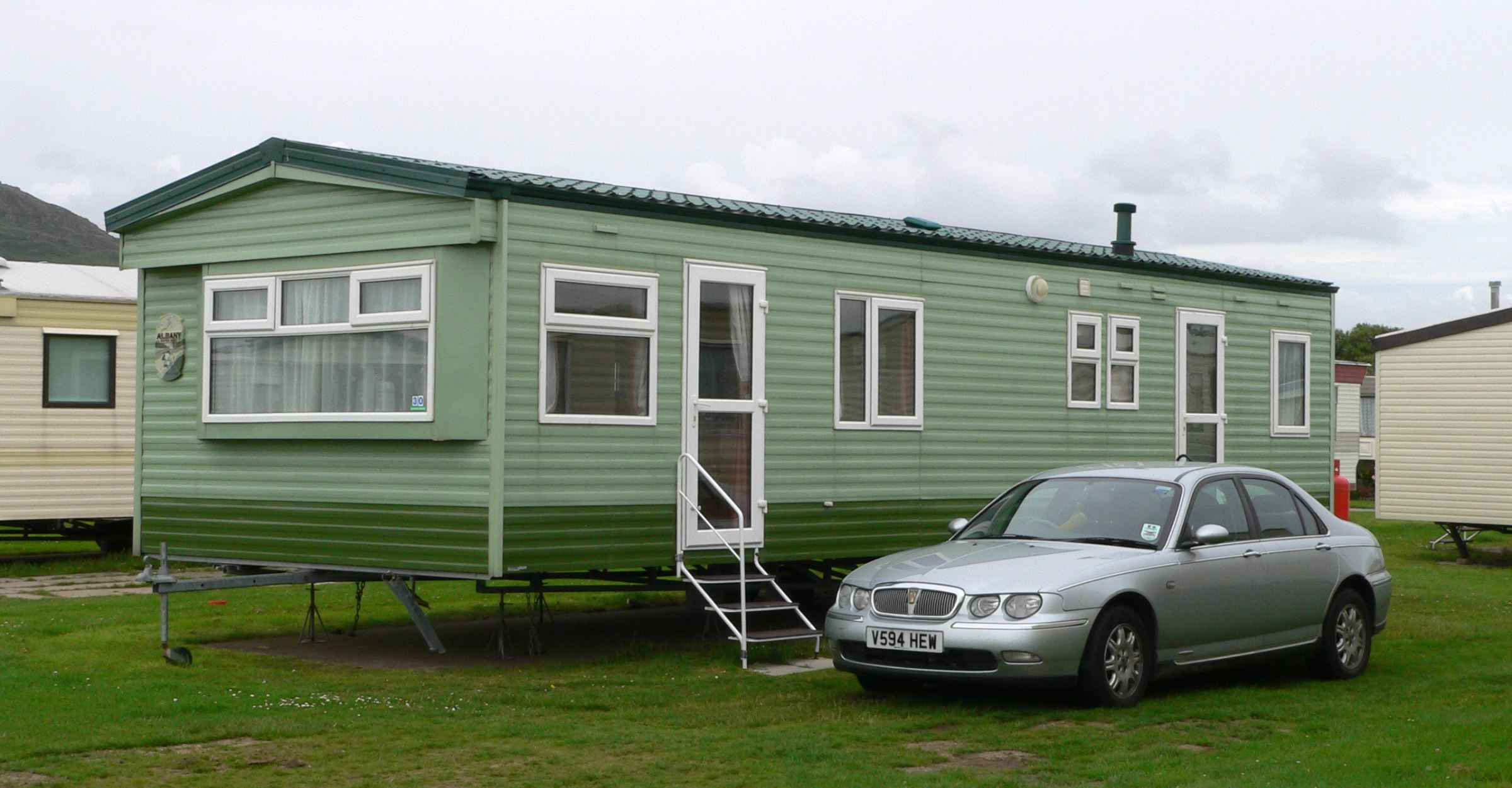 Caravan and car at Greenacres Holiday Park, Black Rock Sands, a couple of miles from Portmadoc.