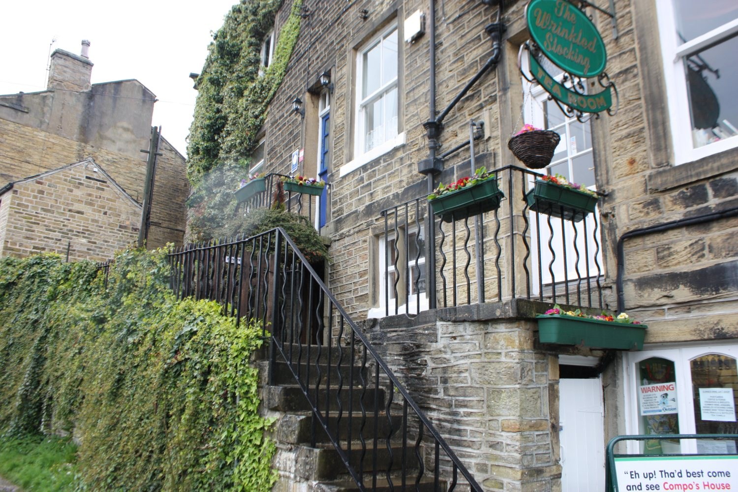 The steps leading up to Nora’s (blue door) and Compo’s (below) houses. Note "The Wrinkled Stocking" Tea Room next door!