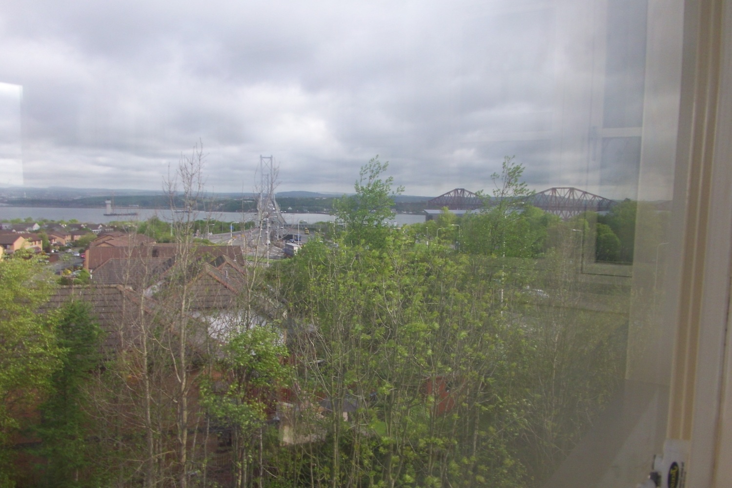 The Forth Bridges, from the South Queensferry Premier Inn. The rail bridge is on the right, the road bridge is in the centre. The pillar in the middle of the river to the left of the picture is part of the construction of a new road bridge. |