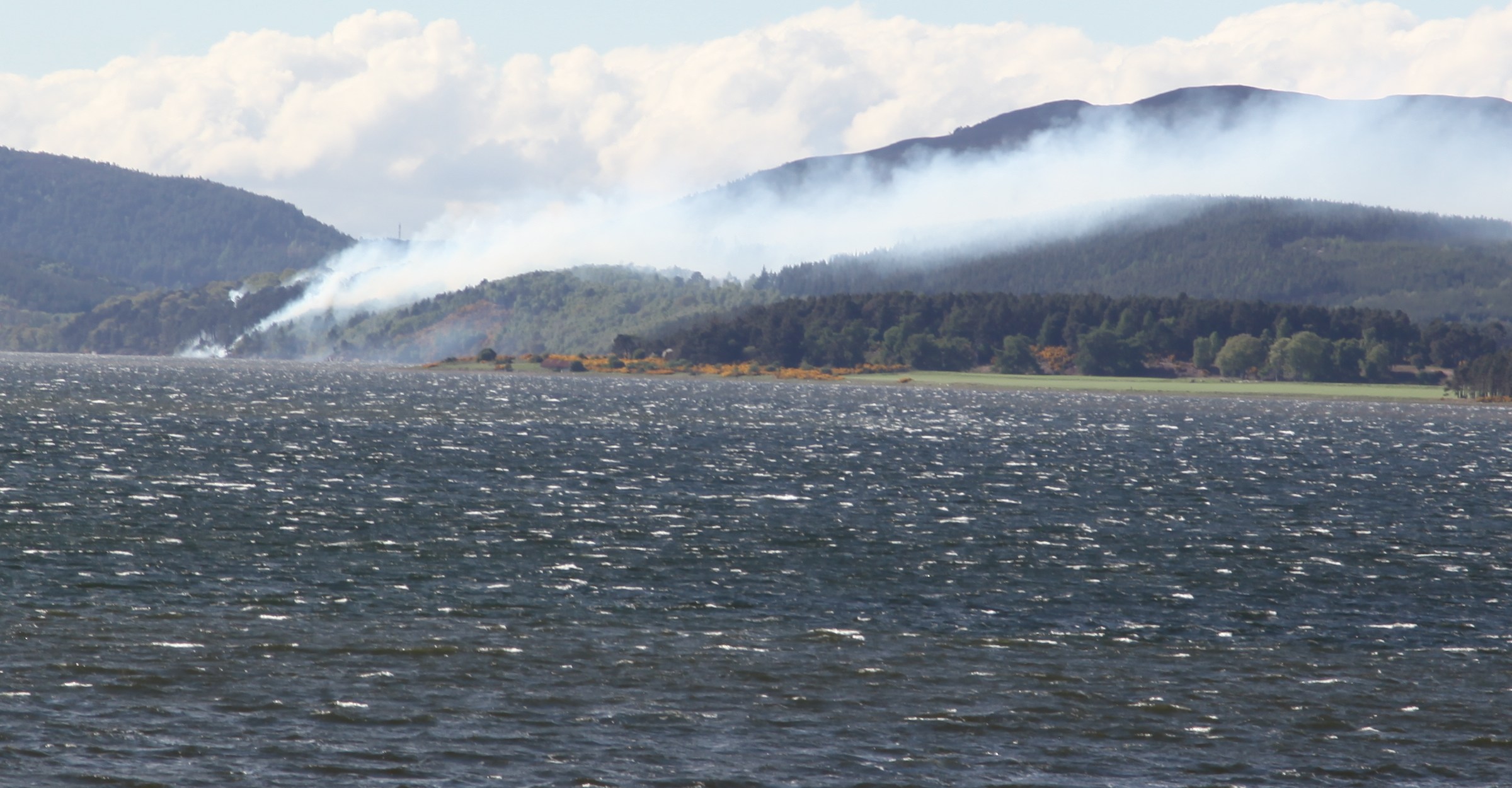 Forest Fire on northern side of Dornoch Firth, from the bridge across Dornoch Firth. We should have been travelling along that side of the loch, but as the road was closed due to the fire, we had a lengthy diversions round the opposite side of the loch. |