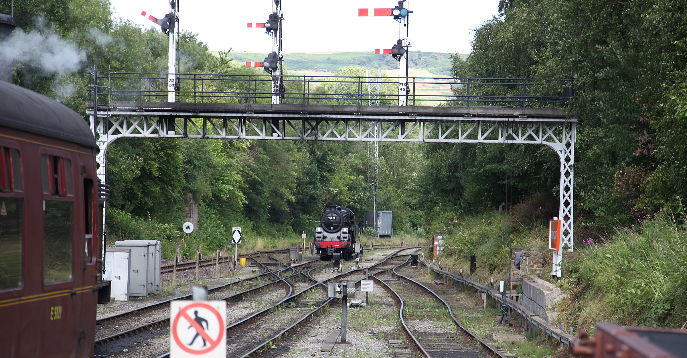 Wednesday, North Yorkshire Moors Railway, and the far end of Grosmont Station. 76079 is a BR "Standard" Class 4MT 2-6-0 built at Horwich in 1957. The left-most line is the Network Rail line from Middlesbrough to Whitby. |
