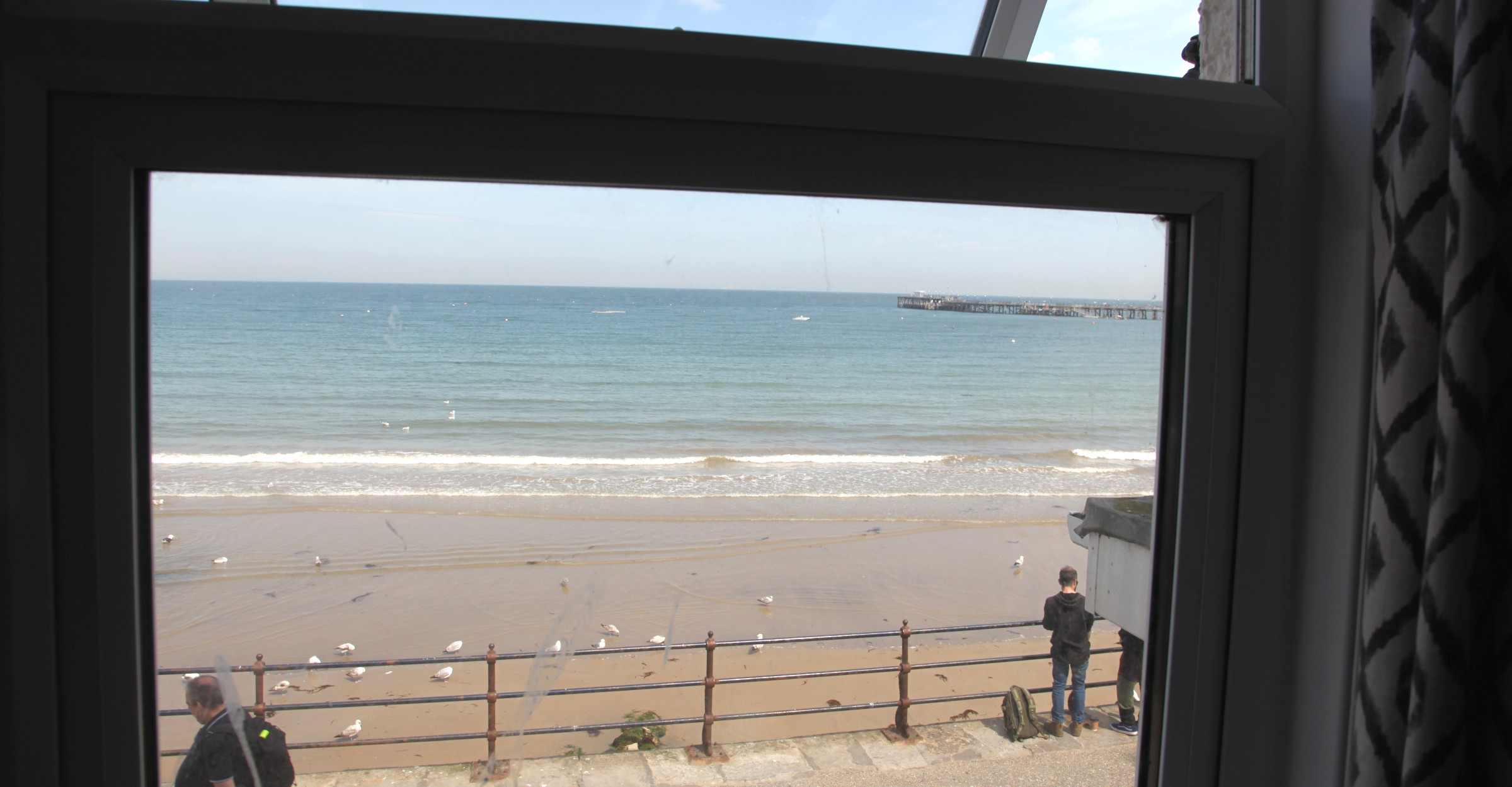 The view from the lounge at the front of the flat. Note the pier and the light coloured raft to the left of the end of the pier.