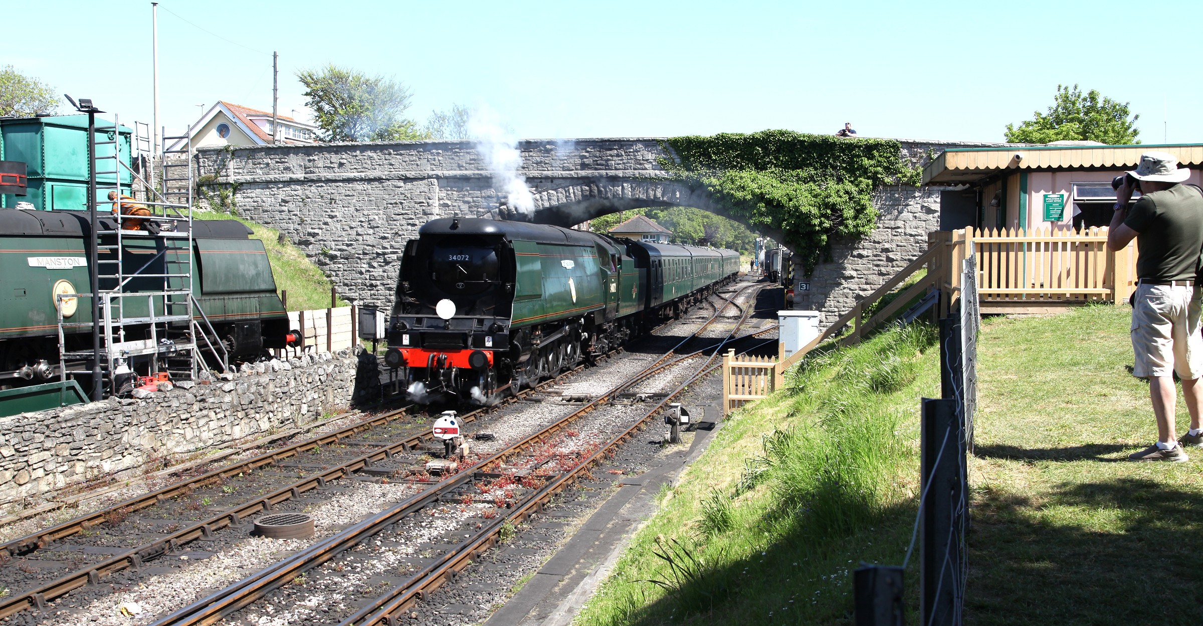 "257 Squadron" leaves with the train, passing sister "Manston" at the shed.