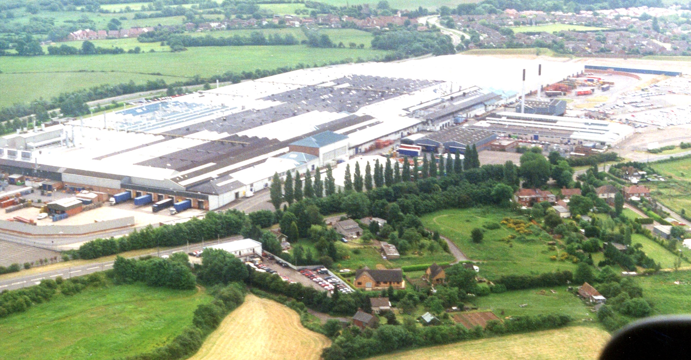 Peugeot Ryton Works, with the A423 Oxford Road (to Southam) in front of the factory, and the A45 behind.