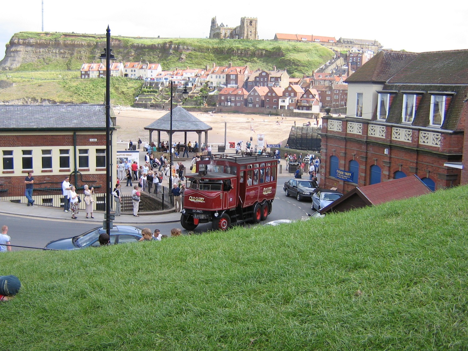 Whitby. The steam bus is a 1931 Sentinel DG6P which was originally a freight truck. It was preserved in 1962, and converted into a tour bus by Northern Star Motor Carriage Company, specifically for use in Whitby, though has since been sold on and the last I heard, it was in Weston-super-Mare. |