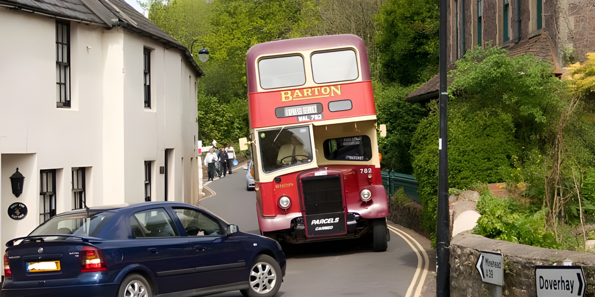 The following two photos of the Barton double decker were not taken by me (as that is me in the driver's cab, complete with Johnson's shirt and tie!), but were found on the internet. Here we are just arriving in Porlock from Minehead. |