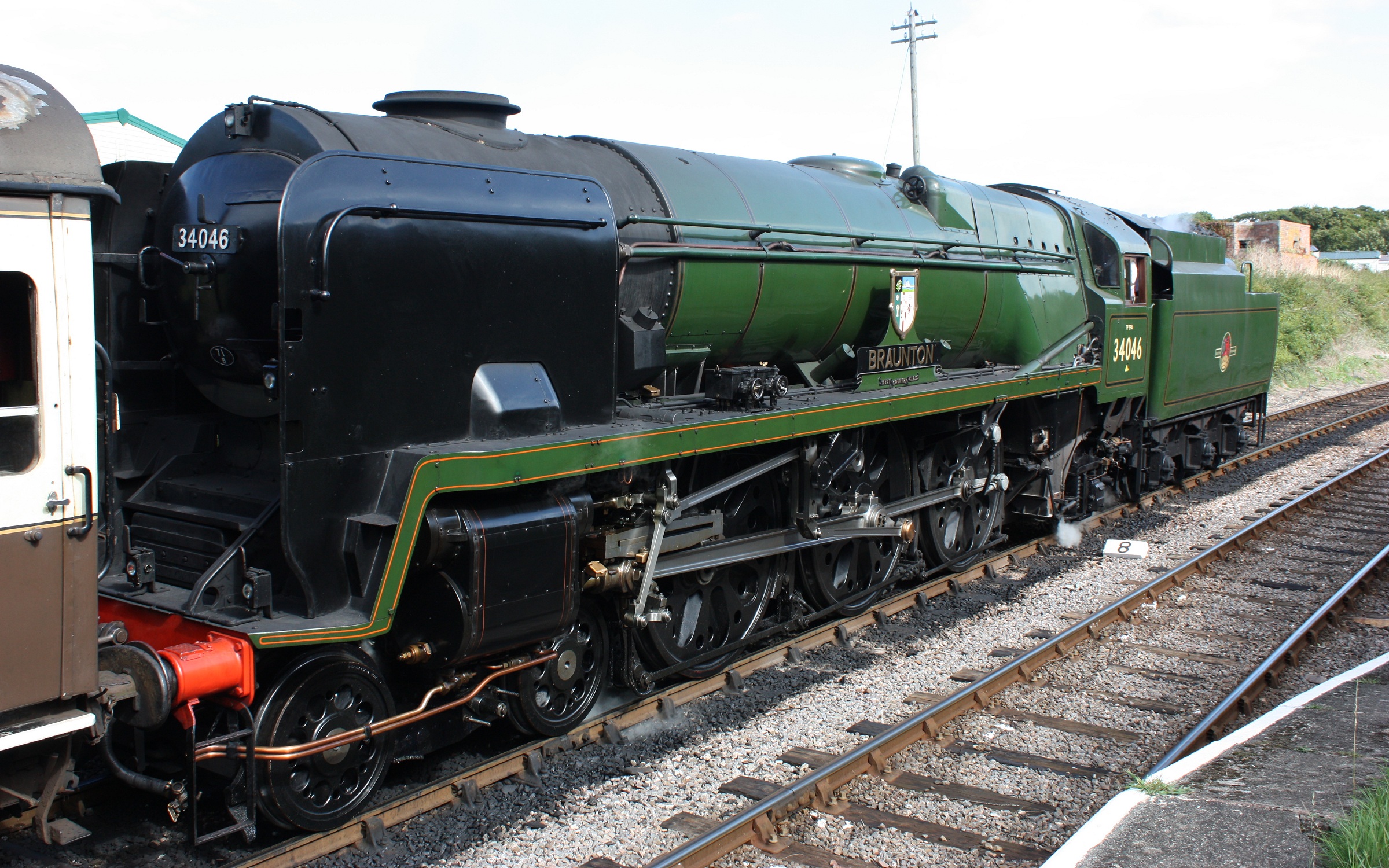 34046 Braunton: Under British Rail, it was renumbered as 34046 in 1949. Designed by Oliver Bulleid (the Southern Railway's Chief Engineer), it originally had "air smoothed" cladding around the boiler area, and chain-driven valve gear. |
