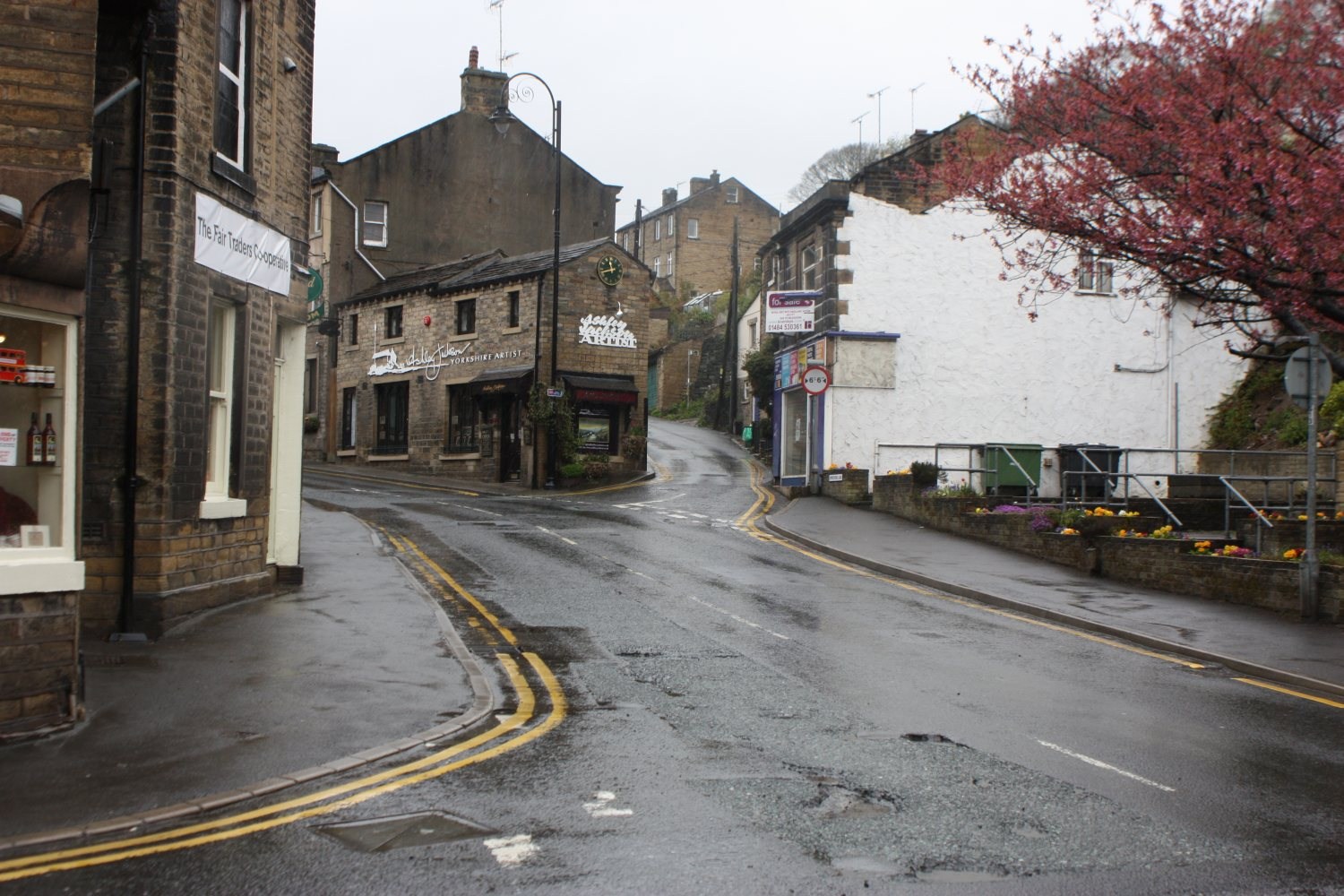 A typical narrow street in Holmfirth. Ashley Jackson, whose studio can be seen in the centre of hte picture, is a local artist, who appeared briefly, as an artist painting the local landscape, in the episode "The Loxley Lozenge".