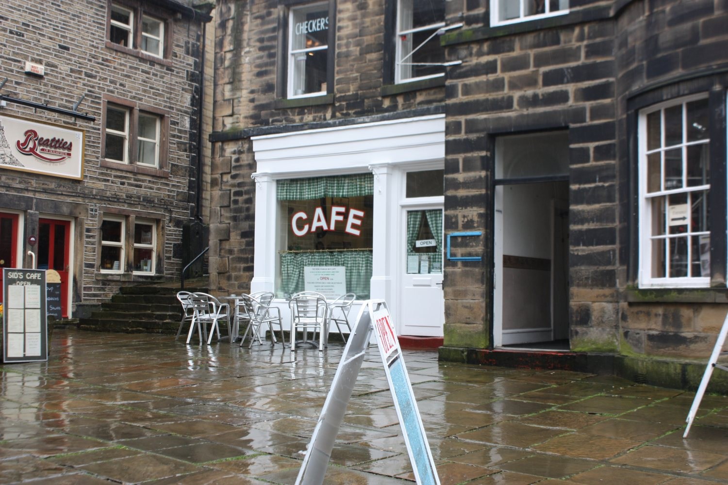 Sid’s Café – which now really is a café! It was formerly a Fish & Chip shop, but when the show started, in 1973, it was being used as a store room by the hardware shop next door. It was given a makeover for each film appearance, until the success of the TV series made it worthwhile for the owner to turn it into a real café! The Parish Church is immediately to the left. |