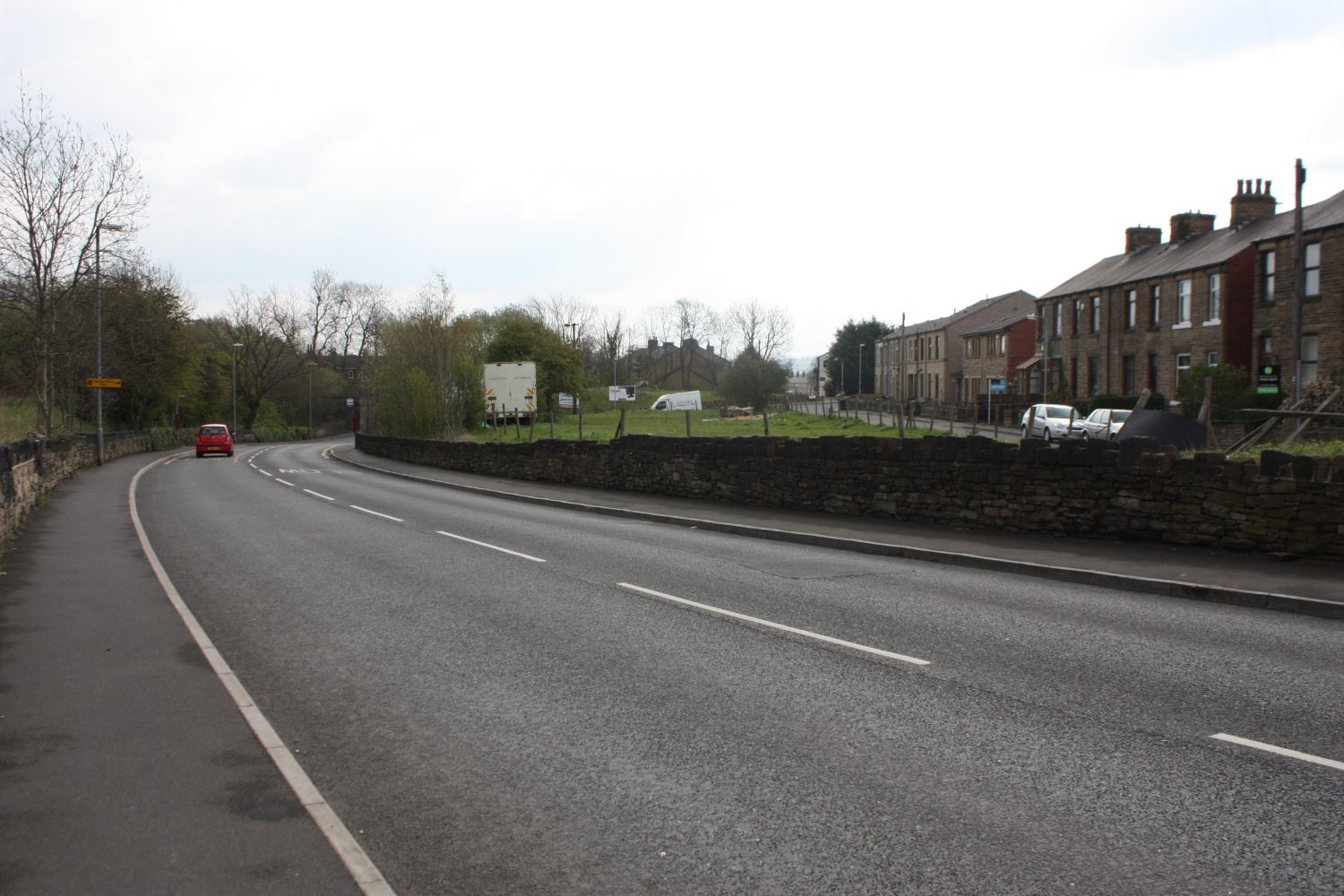 Taken from the same spot as the last photo, but swinging left to look down Shillbank Lane. In the bottom of the dip used to be a railway bridge over the road, with Northorpe Lower Station built on the bridge. The former Station Hotel and the Fish & Chip shop we saw earlier are the far side of the former railway line. The original Shillbank Lane is to the right, with my maternal grandmother’s house towards the right edge of the picture with the white window sills. The new road to the left was built to go under the railway line when the increase in traffic made the level crossing on the old road impractical. |