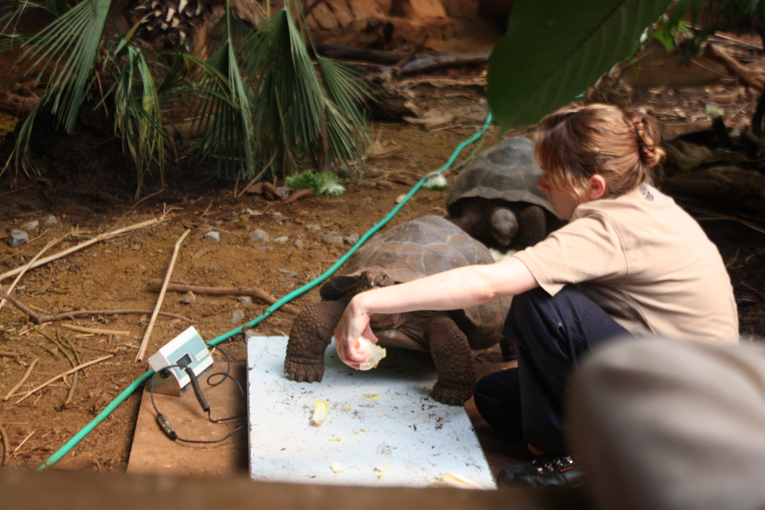 Enticing a large tortoise onto the scales ...