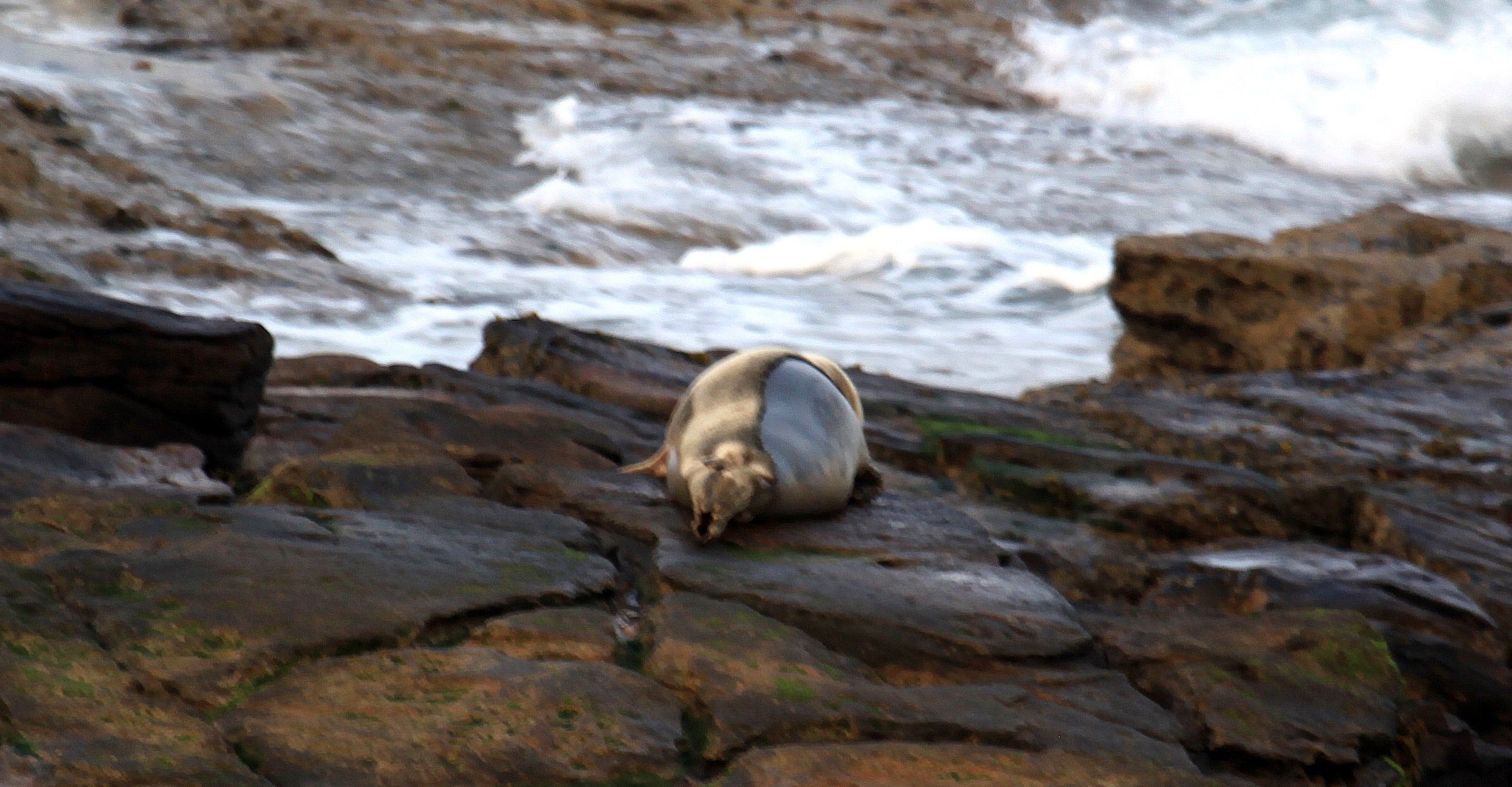 20. Although it looks bright enough, this is only because of the compensation provided by the camera settings, and the dark conditions are why the photo is not as clear as the previous ones. One of the wardens pointed this seal out to us - it is part way through moulting, so as you can see, the left side is still covered with fur whilst the right side is bare skin. It will take about two weeks for the whole process to be complete, and for the new fur to start to grow. |