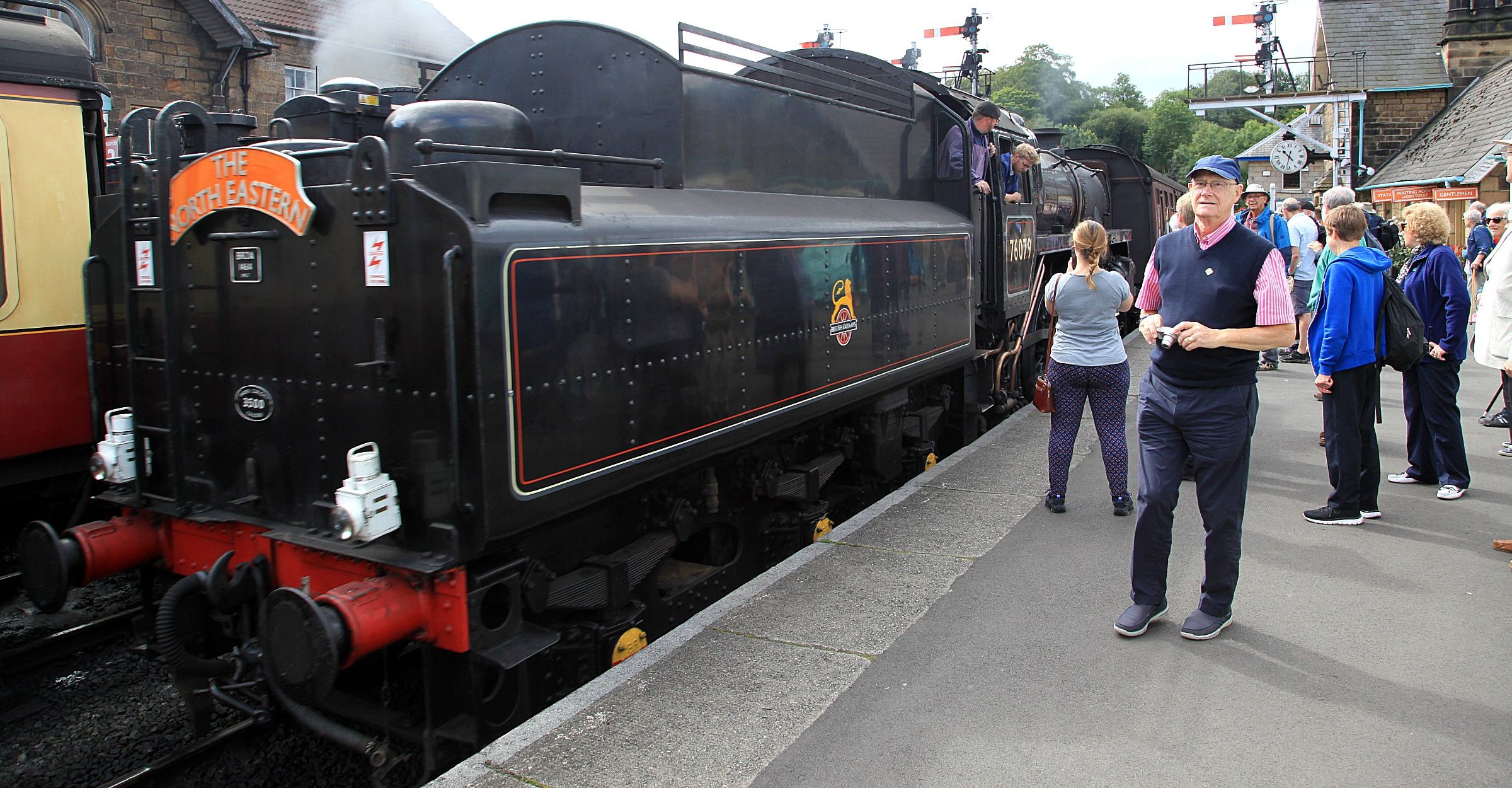 50. Arriving from the Pickering direction is our train, which will take us to Whitby, with the engine running backwards (or to use the correct terminology, "tender first").
