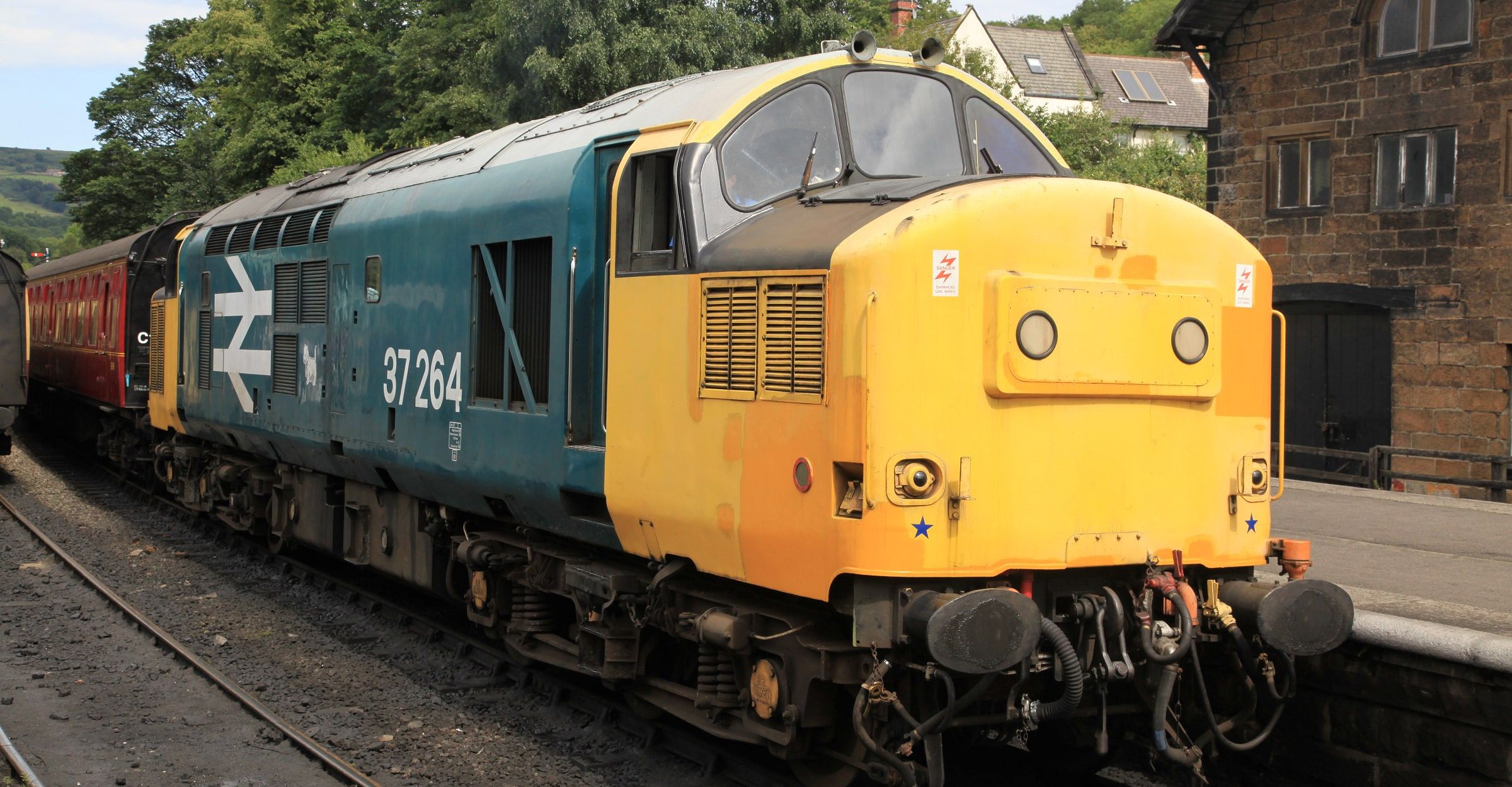 55. Back at Grosmont, and for some reason, our engine has been taken away and this diesel put onto the front of the train for the rest of its journey to Pickering. It is 37 264 (originally D6964), a BR Co-Co Class 37 built by English Electric (another long-lost part of the erstwhile GEC empire) at Newton-le-Willows in 1965. |