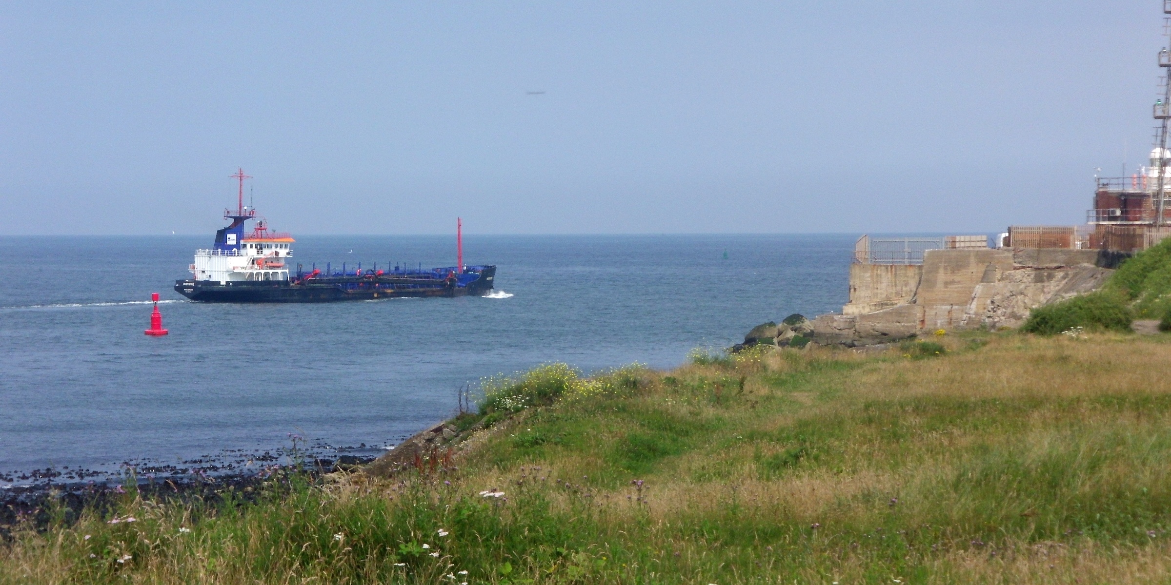 Swinging right again, and looking along the estuary out towards the sea, with a "smallish" boat heading out. Much larger ships than this use the estuary, but have to wait until the tide is in to do so. The wireless mast and lighthouse at the end of the promontory can just be seen at the right edge of the picture. |