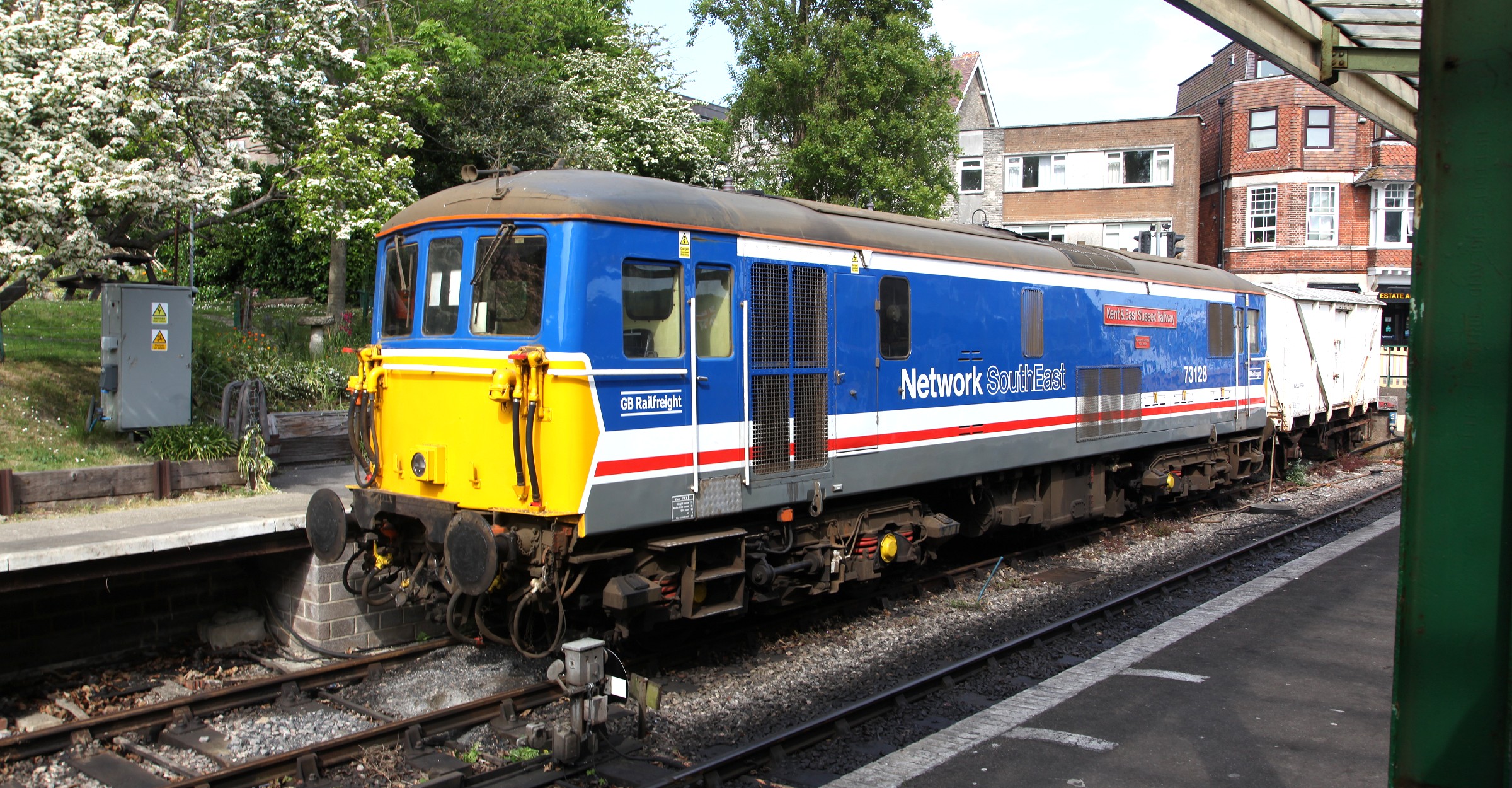 Class 73 73128 is an electro-diesel locomotive that can operate on the Southern Region's 650 / 750 V DC third rail power supply, or by using its own diesel engine. Built by English Electric at Vulcan Foundry c.1966. I was told that there was a problem with it, and it spent most of the weekend sitting here at Swanage! |