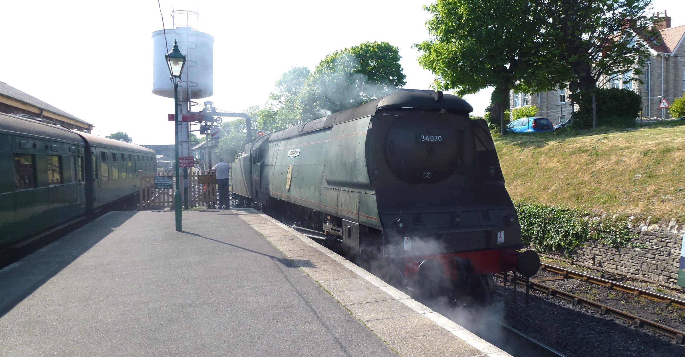 Thursday, and our last day here, so I went for a last look, and found "Manston" now in steam and taking on water from the tank at Swanage Station.