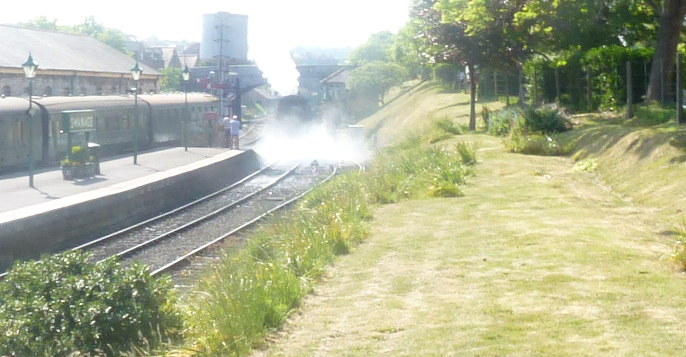 From the bank opposite the station, "Manston" disappears back towards the shed in a cloud of steam.